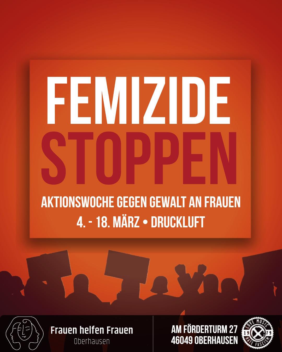 Rund um den Frauenkampftag finden bei uns in Kooperation mit dem Frauenhaus Oberhausen und der Frauenberatungsstelle eine Aktionswoche gegen Gewalt an Frauen statt. Dazu stellen wir im Neuen Café alle von @femizidestoppen gesammelten Fälle 2025 aus und schauen auf das letzte Jahr zurück.