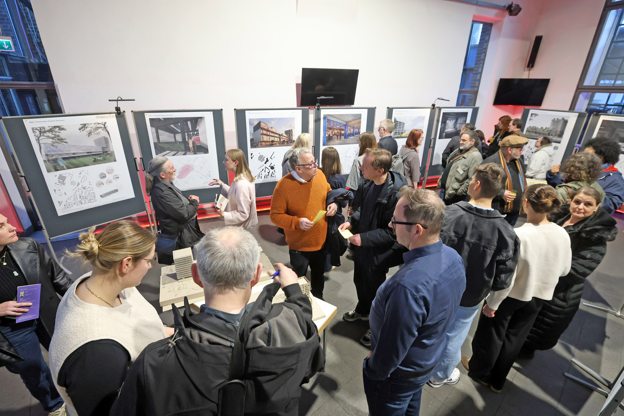 Eine besondere Rolle spielte in diesem Jahr die Ausstellung eines Studierendenprojekts der Hochschule Düsseldorf: Angehende Architektinnen und Architekten hatten sich im Rahmen ihres Studiums mit einer möglichen Umnutzung des Gebäudes der Paketpost am Bahnhof beschäftigt. Eine Auswahl ihrer Ideen und Visionen konnte anhand von Modellen und Plänen bestaunt werden.
