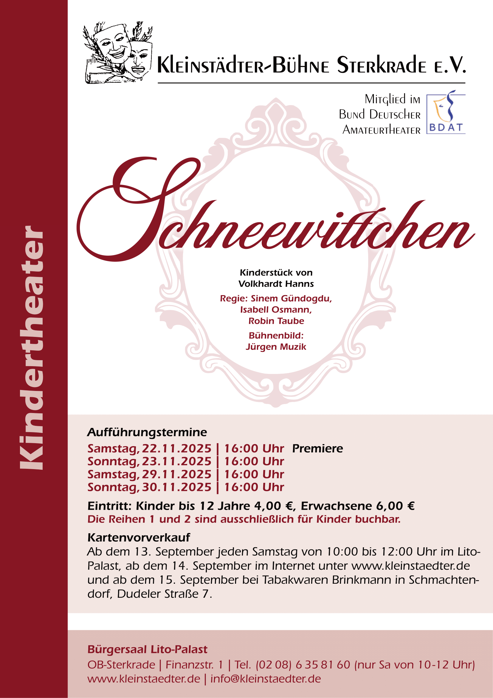 Tickets (10 bis 14 Euro, beim Kinderstück 4 bis 6 Euro) gibt es ab dem 13. September jeden Samstag von 10 bis 12 Uhr im Lito-Palast, ab dem 14. September online auf www.kleinstaedter.de sowie ab dem 15. September bei Tabakwaren Brinkmann in Schmachtendorf, Dudeler Straße 7.