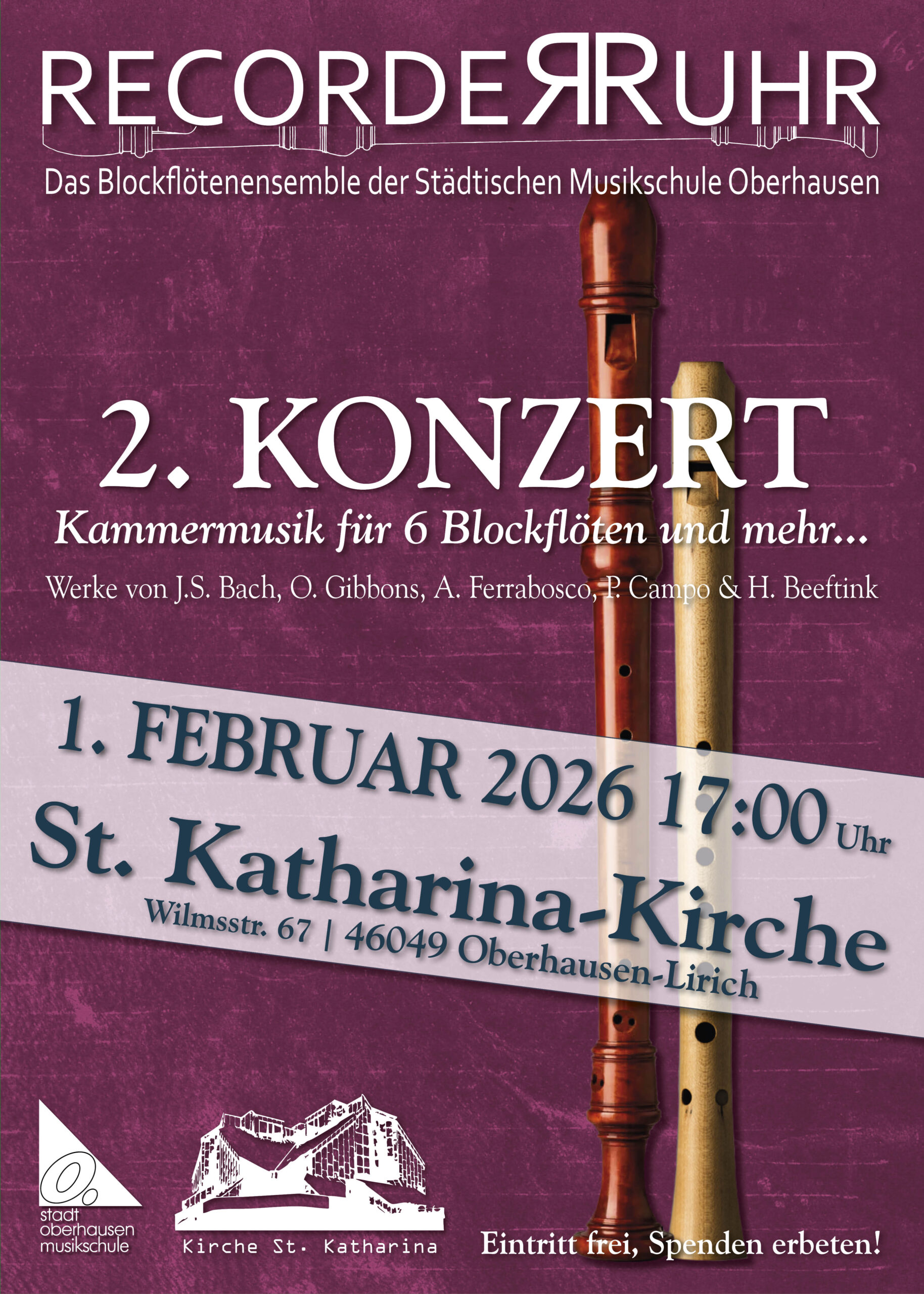 Recorder.Ruhr, das Blockflötenensemble der Städtischen Musikschule Oberhausen, lädt herzlich zu seinem zweiten Konzert ein. Am Sonntag, 1. Februar 2026, 17 Uhr, erklingt in der St.-Katharina-Kirche Oberhausen-Lirich (Wilmsstraße 67) ein abwechslungsreiches Programm mit Werken von Johann Sebastian Bach, Orlando Gibbons, Alfonso Ferrabosco, Pieter Campo und Herman Beeftink.