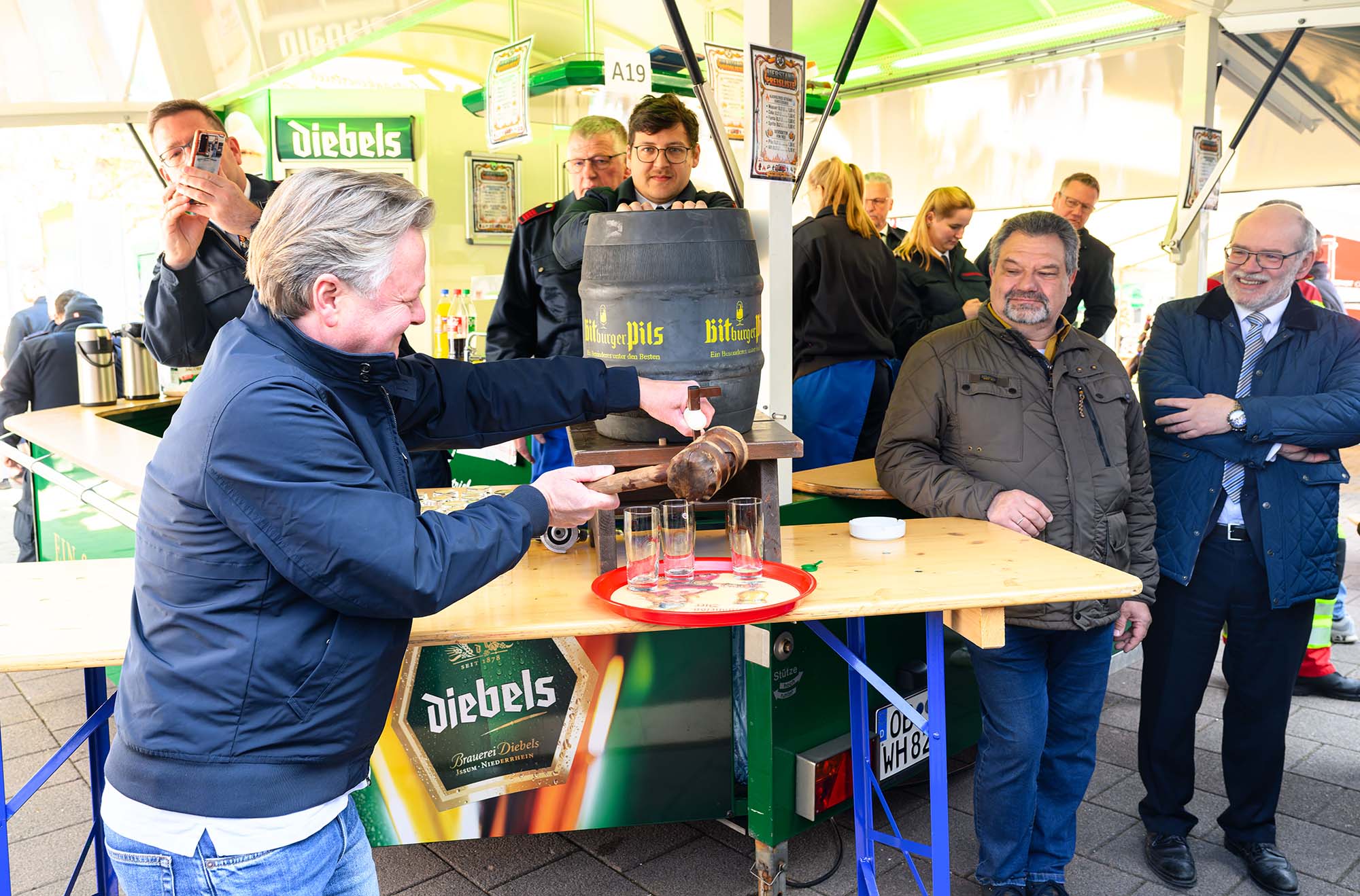 Oberbürgermeister Thorsten Berg eröffnete die Veranstaltung am Samstag um 11 Uhr auf der Bühne vor dem Technischen Rathaus. Im Anschluss begrüßten weitere Vertreter aus Stadt, Sport und Interessengemeinschaft die Gäste, bevor mit dem traditionellen Fassanstich das Bühnenprogramm startete.